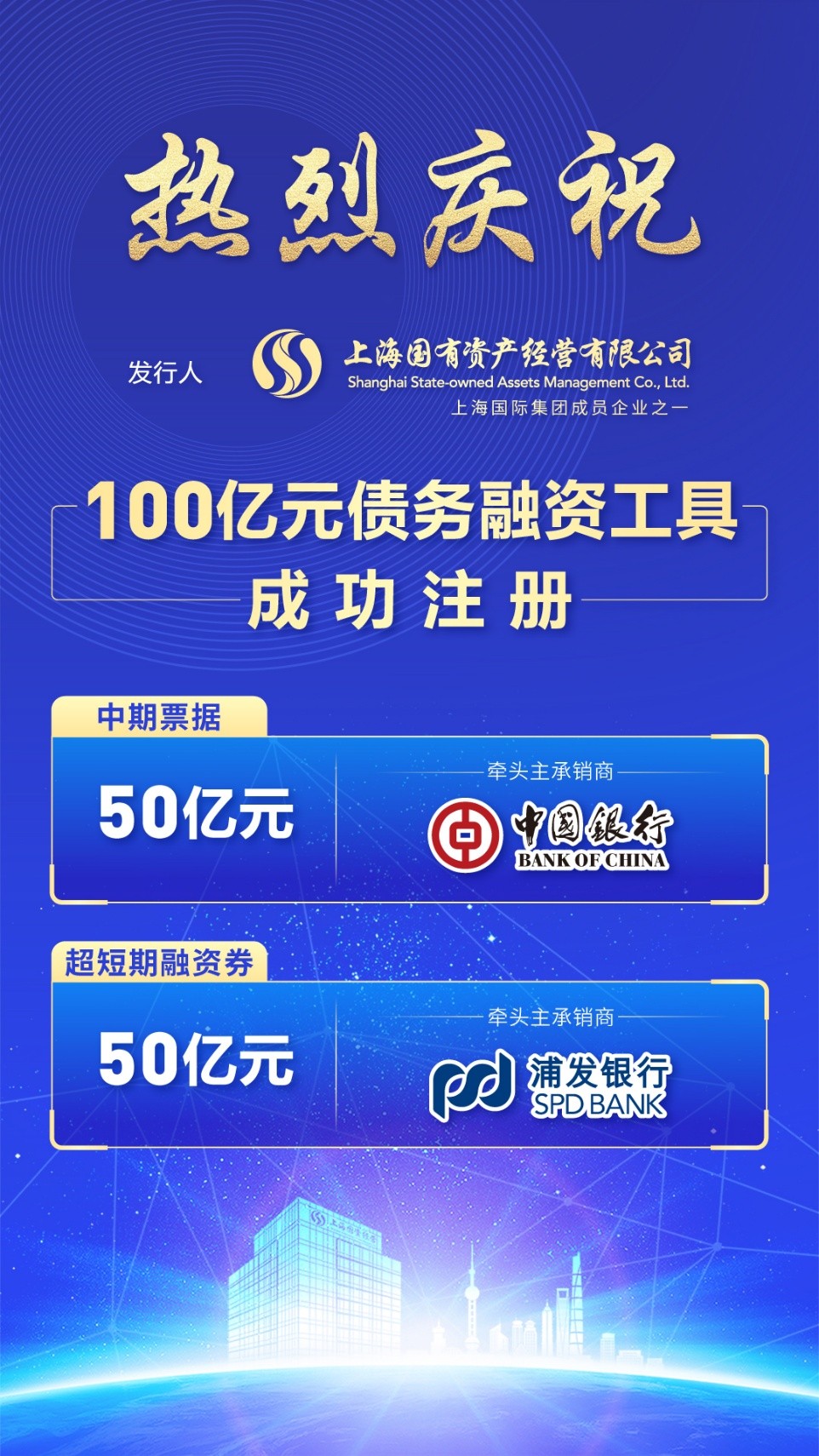10月13日,国资经营公司获批中国银行间市场交易商协会50亿元中期票据、50亿元超短期融资券的债务融资工具注册额度,批文有效期两年。年内公司已成功获取中国银行间市场交易商协会与上海证券交易所两大市场、多个品种合计260亿元的注册额度批文,彰显了监管机构对公司作为优质主体发行人的充分认可。
